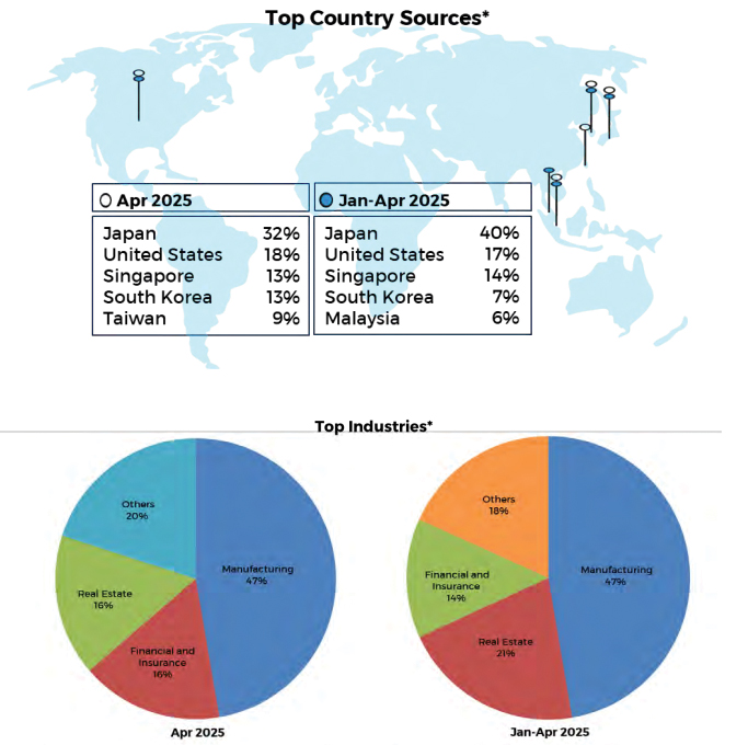 The BSP said most equity placements in April came from Japan, the United States, Singapore, South Korea, and Taiwan. These were channeled largely into manufacturing, financial services, and real estate.