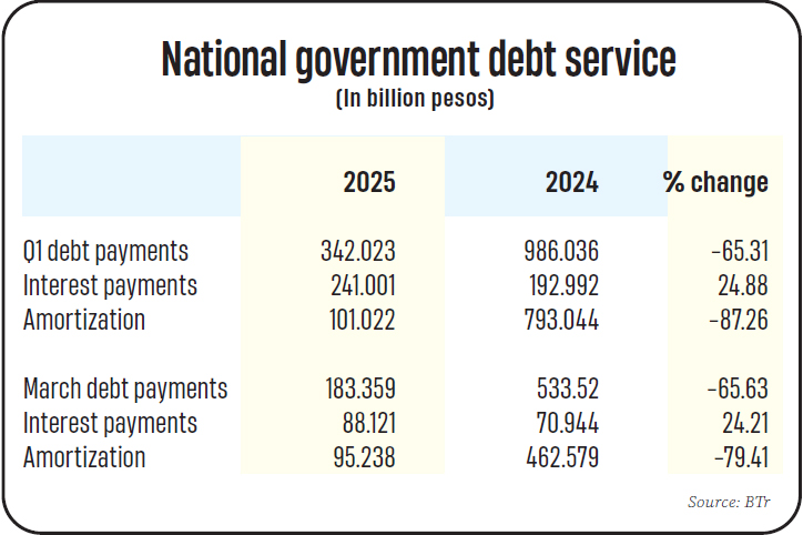 Data posted on the BTr website as of Sunday showed debt payments in the first three months of 2025 stood at P342.023 billion, compared with P986.036 billion in January to March 2024.