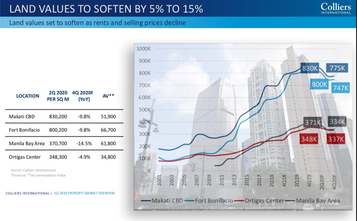 Property consultant Colliers International sees land values declining between 5 and 15 percent this year amid challenging business environment.