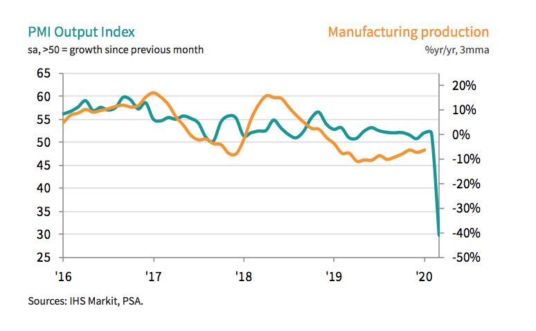 Owen pointed out that manufacturing sales were stymied in March, with clients having to massively reduce order books amid much weaker consumer demand.