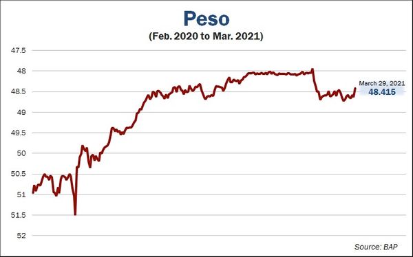 The peso closed at 48.415 to the dollar, up from 48.49 on Friday.
