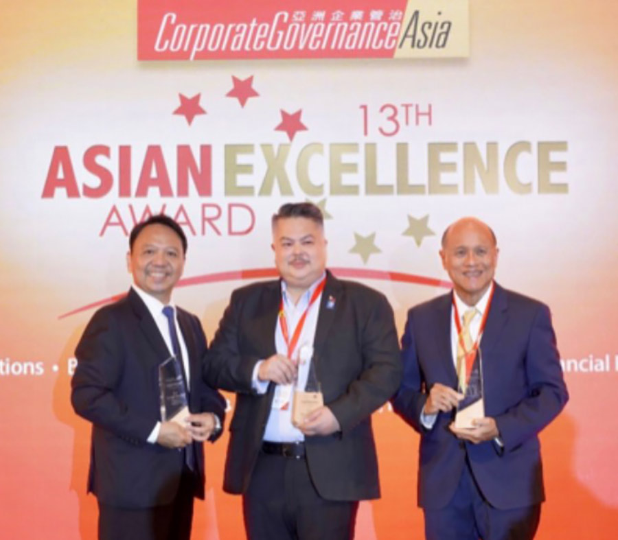 Receiving the awards during the publication’s 13th Asian Excellence Awards at JW Marriot Hotel in Hong Kong last June 26 from Aldrin Monsod (left), Corporate Governance Asia publisher, were GT Capital executives Crisol, Jr. (middle) senior vice president and head of investor relations, strategic planning, and corporate communication and Suarez, Jr. (right), executive vice president and chief finance officer.
