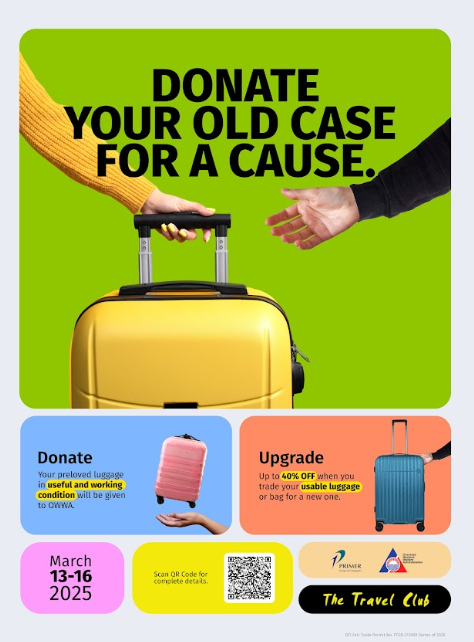 The Travel Club launches its Trade-In for a Cause initiative March 13-16, 2025, at SM Mall of Asia, Eastwood Mall, and Estancia Mall. Customers can trade pre-loved luggage and bags for up to 40% off select travel gear.