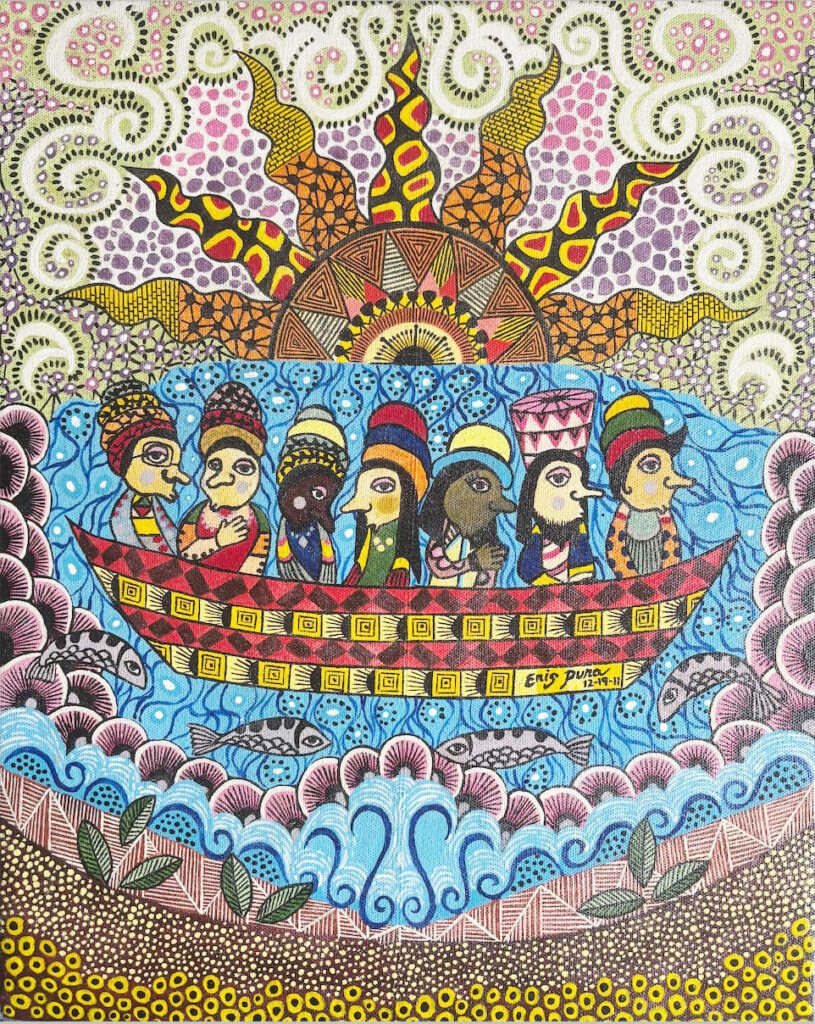 In 2011, a friend I had helped through an illness gave me a painting as a thank-you gift. It showed seven royal-like figures in a long boat, surrounded by waves, fish, and an elaborate sun. On the lower right corner of the boat, a signature and date read: “Enis Pura, 12-19-11.” My friend bought the artwork in Quiapo from a Tausug artisan.