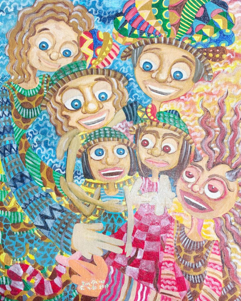 Two years later, the same friend gave me another piece by the same hand. Six round-eyed figures in intricate garments and headpieces stood close together against a backdrop of blue streaked with orange and yellow. Unlike the first, which suggested voyage and myth, this one felt like family gathered in celebration.