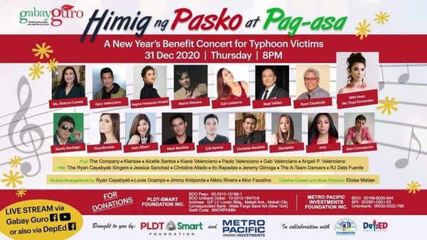 Presented by PLDT-Smart Foundation Inc. and Metro Pacific Investments Inc., in collaboration with the Congressional Spouses Foundation Inc. and the Department of Education (DepEd), the almost two hour show will be streamed via the Gabay-Guro and DepEd Facebook pages and the Gabay Guro Youtube channel beginning at 8 p.m. on Dec. 31.