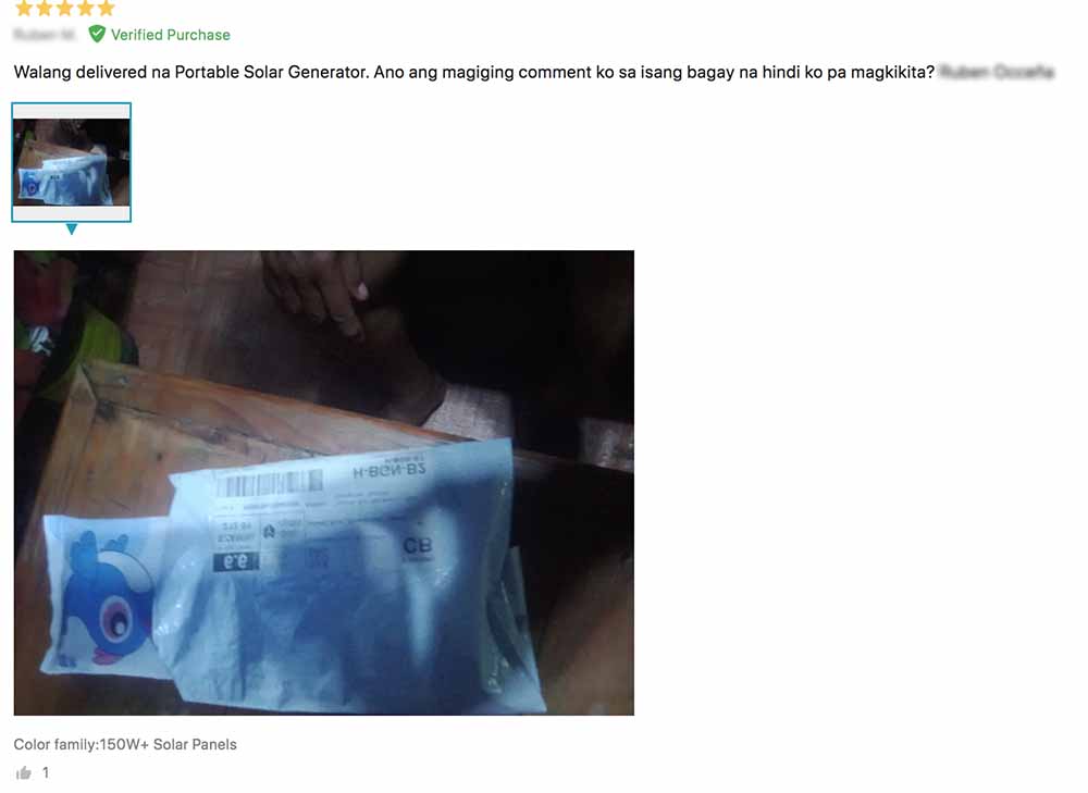 After a week of waiting I received a tiny package, the size of a letter envelope which listed the items that I ordered–2 stand fans, a TENS machine and a desk cooler. I was scammed. And I was not the only one, upon investigation, six other people were fooled by this Hong Kong based supplier.