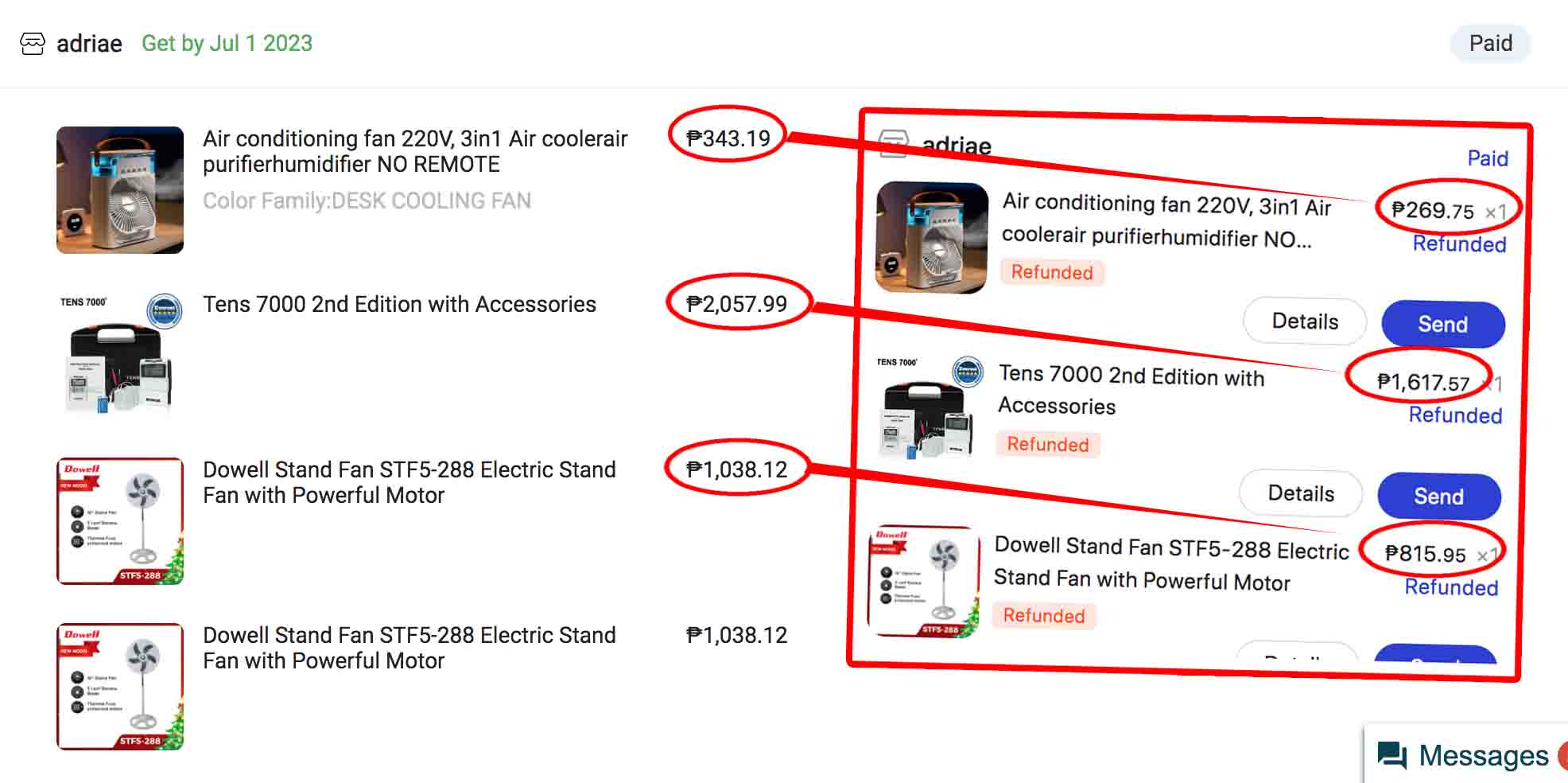 Scammers like adriae use this technique to mulch from buyers, in my case getting over P1000 from what is owes me. My refunds were marked as “orders with anomalies.” I went back to Lazada to get the full refund and I was assured that Lazada itself would fill in the discrepancy.
