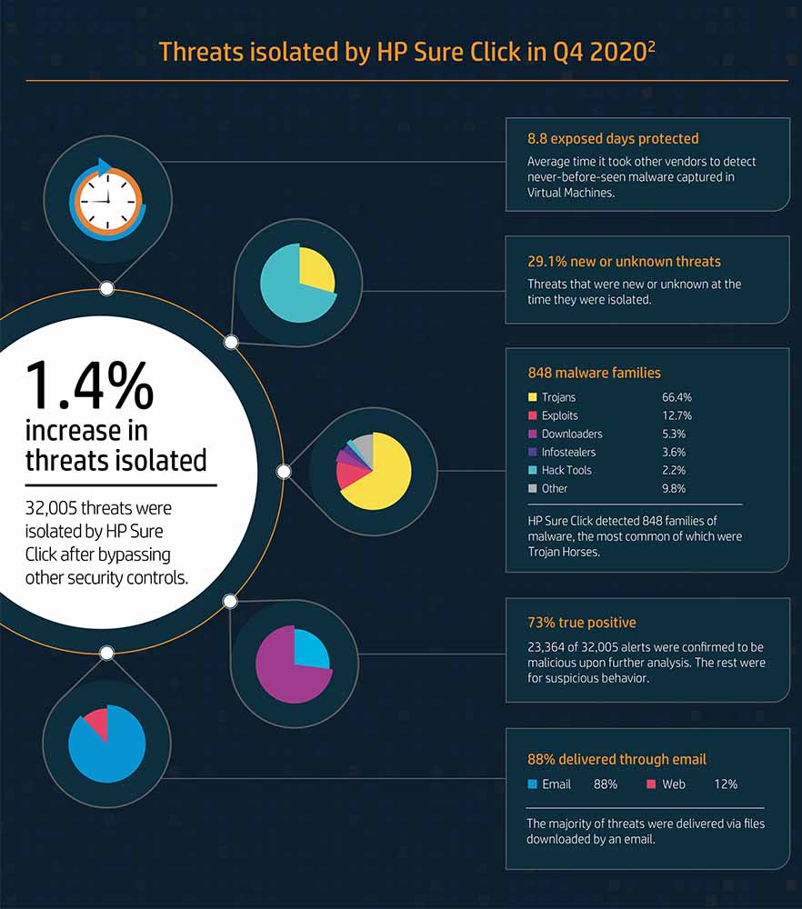 The report provides a unique glimpse into the behavior of malware in the wild, as — unlike other endpoint security tools, which aim to prevent or intervene in an attack — HP Sure Click lets malware run, tricking malware into executing, while capturing a full infection chain within isolated, micro-virtual machines. This hardware-enforced approach to security renders malware harmless and keeps customers safe.