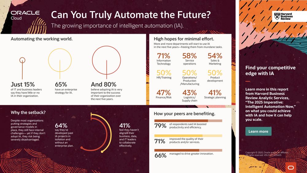 According to a recent global pulse survey from Harvard Business Review Analytic Services, sponsored by Oracle, IA is already being used in virtually every department in an organization — from automating repetitive and cognitive tasks to free up resources for more valuable work, to simplifying approval processes and improving the decision making process.
