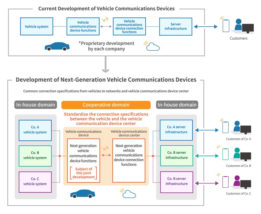 In response to these circumstances, the companies can provide safer and more convenient connected services to customers as early as possible, by positioning the development of vehicle communications devices, which are basic functions of the connected car, as a cooperative domain; positioning the development of applications and services as an in-house domain, and achieving greater efficiency and accelerating the development of vehicle communications devices. Each company can focus more on the development of applications and services on this common infrastructure through these steps.