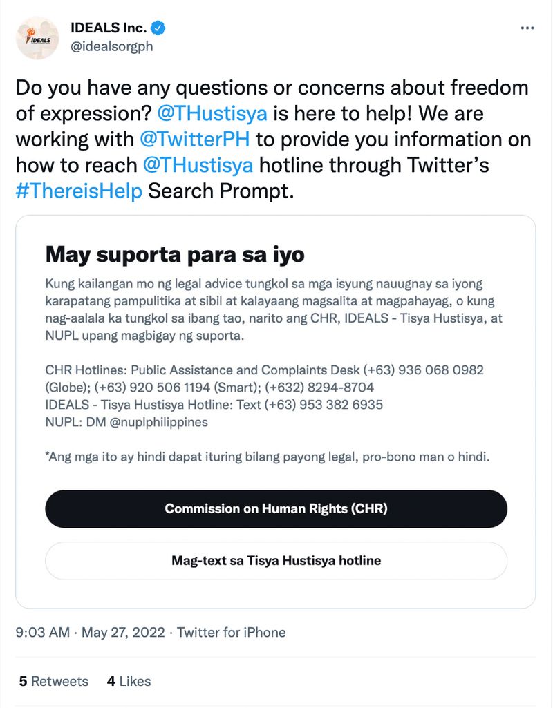As part of this initiative, Twitter is partnering with local civic and government organizations (@idealsorgph, @chrgovph and @nuplphilippines), and the notification service will appear whenever people search keywords associated with freedom of expression on Twitter. The prompt will make available hotline numbers of these organizations and links to local partners to those in need of advice or access to resources related to freedom of expression and digital rights.