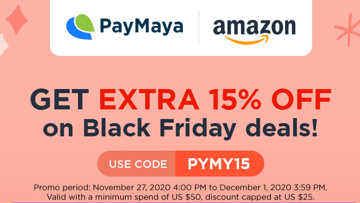When you shop on Amazon.com using your PayMaya virtual or physical card from 4:00 PM on November 27 to 3:59 PM on December 1, 2020, you can get a 15 percent discount of up to USD$25 on top of the amazing deals you can find on the site! All you have to do is enter your shipping address in the Philippines and use the discount code PYMY15 upon checkout for a minimum purchase of USD$50 (before taxes, shipping and fees).