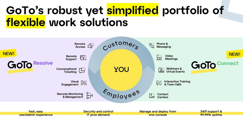 GoTo also announced the release of a new IT management & support (ITSM) product, GoTo Resolve. GoTo Resolve modernizes IT support by bringing together all the tools small and midsize businesses (SMBs) need to manage and support employees in a flexible, secure, and conversational way. The launch of GoTo Resolve coupled with continued evolution and enhancements to GoTo unified communications and collaboration (UCC) solutions with products like GoTo Webinar, GoTo Meeting, and more, allow SME IT teams to seamlessly manage their systems and communicate with their employees to get the right information and fix issues quicker through a single provider and application. GoTo’s unified administration center brings together these products, giving IT leaders a single app from which they can manage their users, entitlements, and configurations.