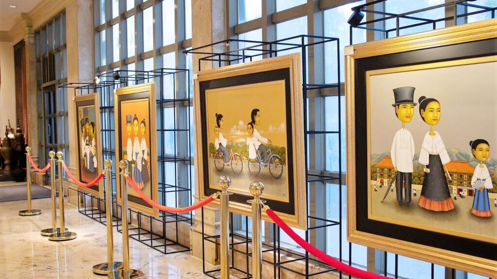 His signature elongated figures in colonial-era attire, set against romanticized Old Manila or countryside scenes, have become icons of cultural memory. His works have been featured at Sotheby’s, Christie’s, and in landmark murals like “The Great Promenade of Philippine-American Friendship” at the Philippine Embassy in Washington, D.C.