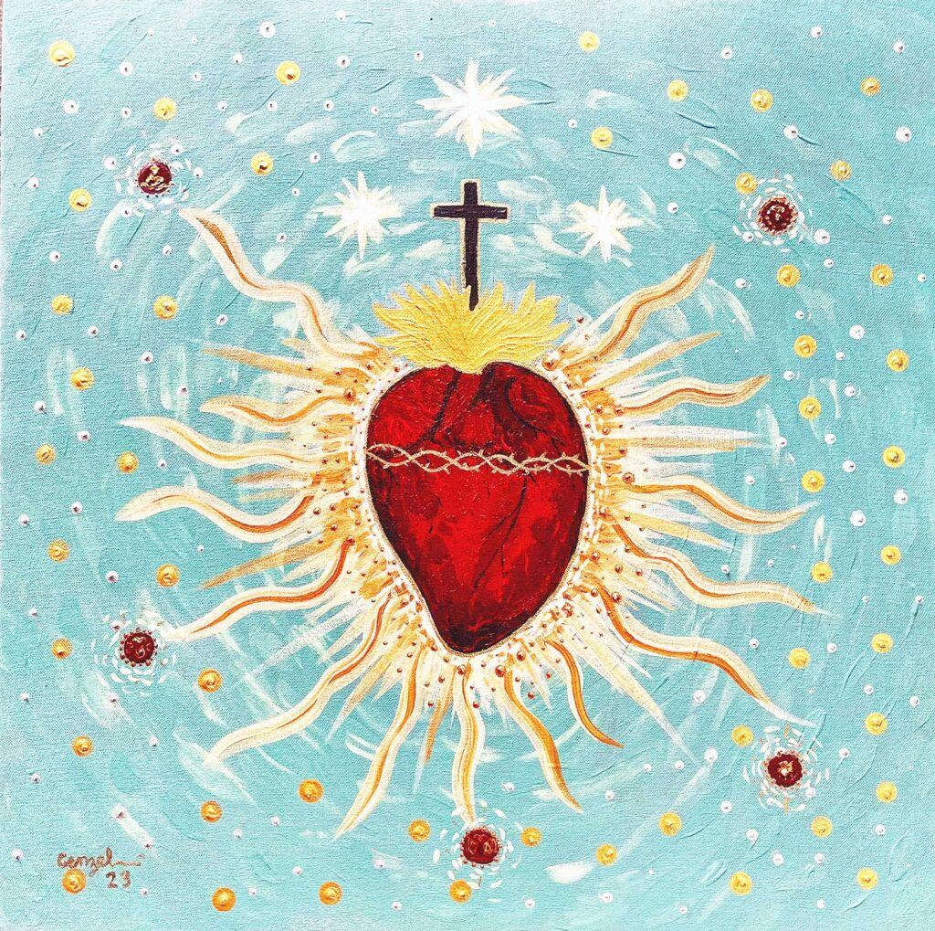 I first came across Heart of Faith on a gallery’s Instagram page: a 24-by-24-inch acrylic on canvas by Genzel San Jose, a young, emerging artist. The composition was quiet, yet quietly stirring. The Sacred Heart floated in a teal blue field—deep red and textured, encircled by soft gold rays. A small cross rose from a flame, while faint stars drifted around it. There was no drama, no grandeur. Just a stillness that invited contemplation.