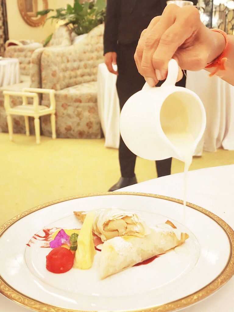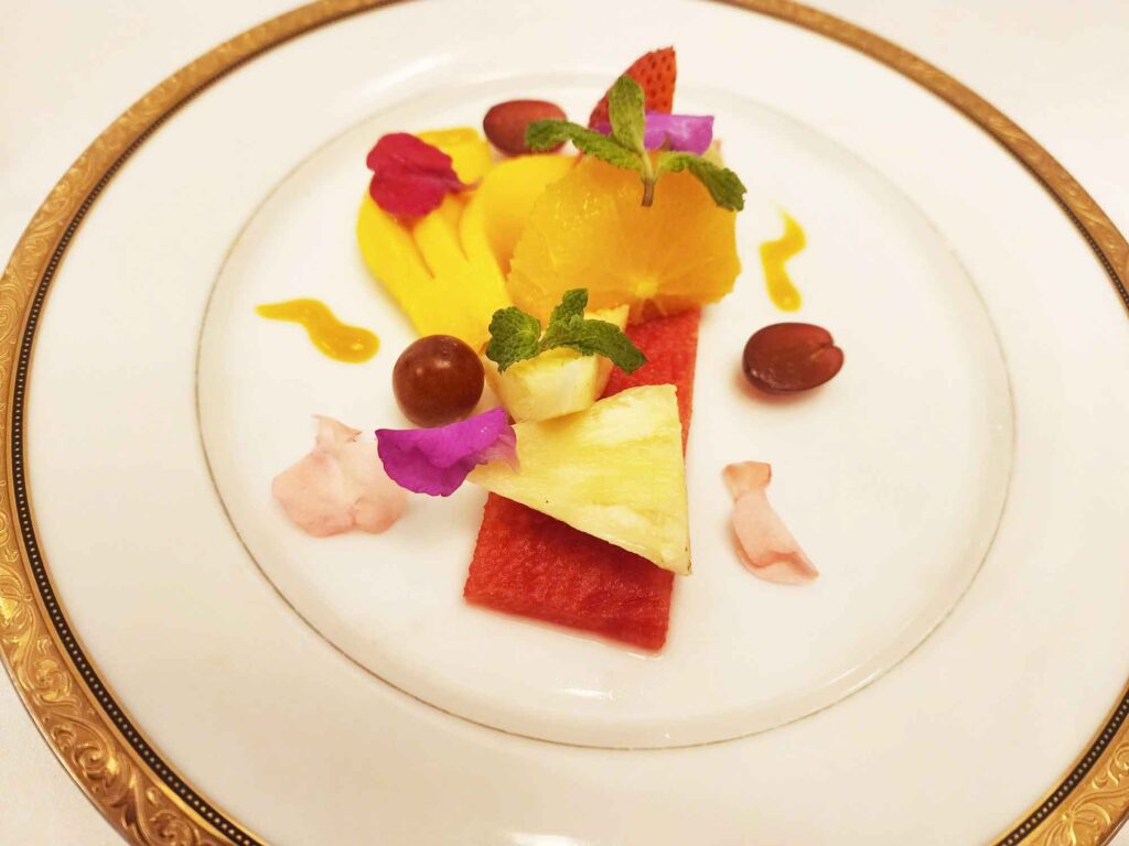 The meal winds down with a selection of fresh fruits. This is then followed by a Guava Strudel for dessert which is served alongside a coconut cream, honey, and lemon grass sauce that accentuates the tropical feel of the sweet dish. Finally, some Vegan Chocolate Pralines close out the meal.