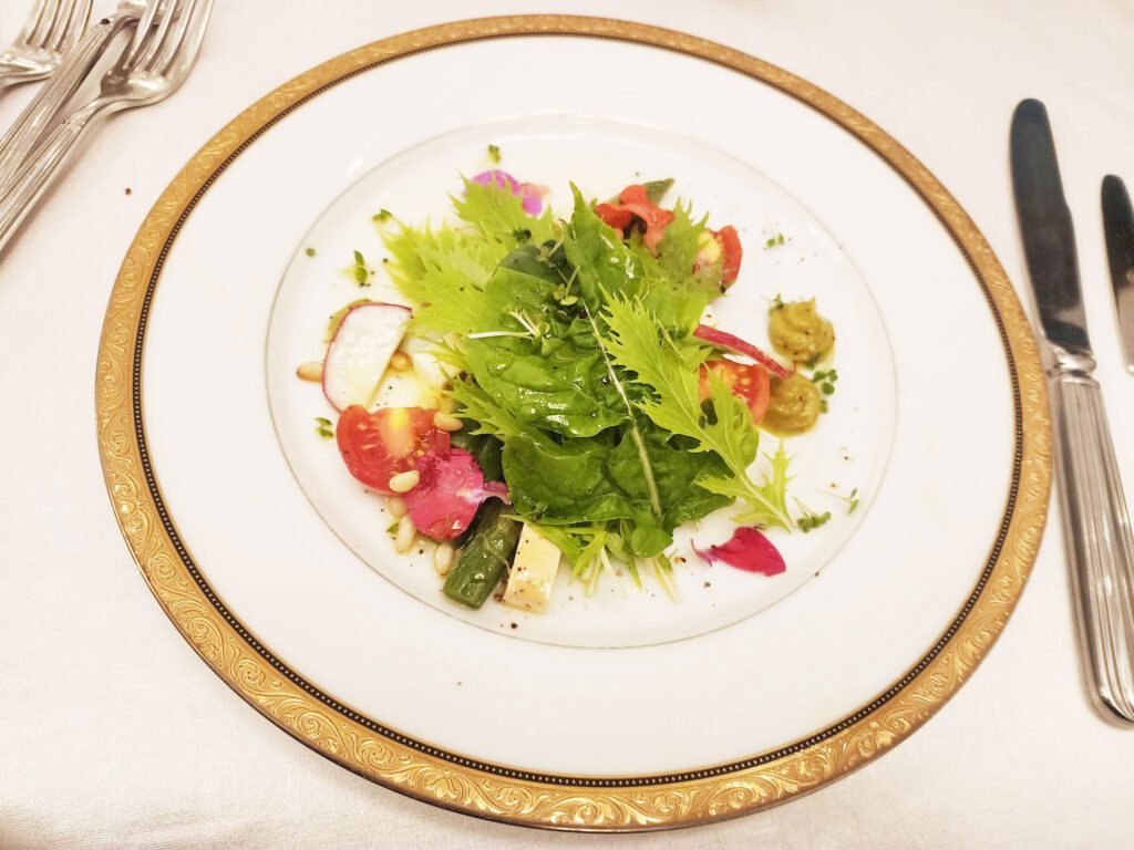 Champagne Salon celebrates Mediterranean and French cuisine for September. The meal starts of with Green Asparagus Salad in Olive Oil and Lemon Dressing. Here, hearty stalks of charred asparagus are topped with fresh salad greens and herbs and tossed in a tangy dressing. The addition of pine nuts, guacamole, and vegan cheese add richness and texture to the salad.