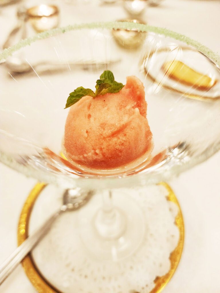 For the pasta course, Champagne room presents a vegan take on a classic ravioli recipe. Here, instead of cream cheese used a stuffing, the raviolo is stuffed with tofu and spinach, maintaining the creamy taste and texture while keeping the course vegan. A light brush of garlic-sage vegan butter adds a nutty and savory note that ties the dish together. A red currant sorbet is served afterwards to cleanse the palate for the next course.