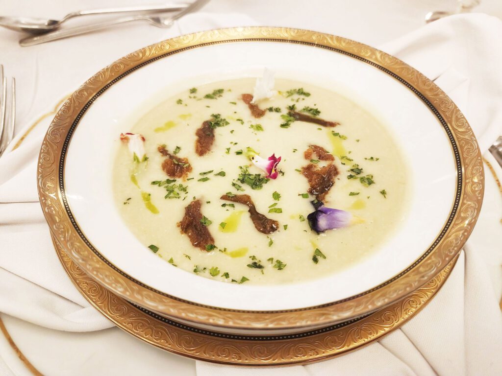 This was followed by a hearty bowl of Puree of Potato Soup with Kale. Crunch is added using Manila Hotel’s own take on veggie meat which is crisped up to resemble bacon strips. Edible flowers dot the soup, adding color and freshness.