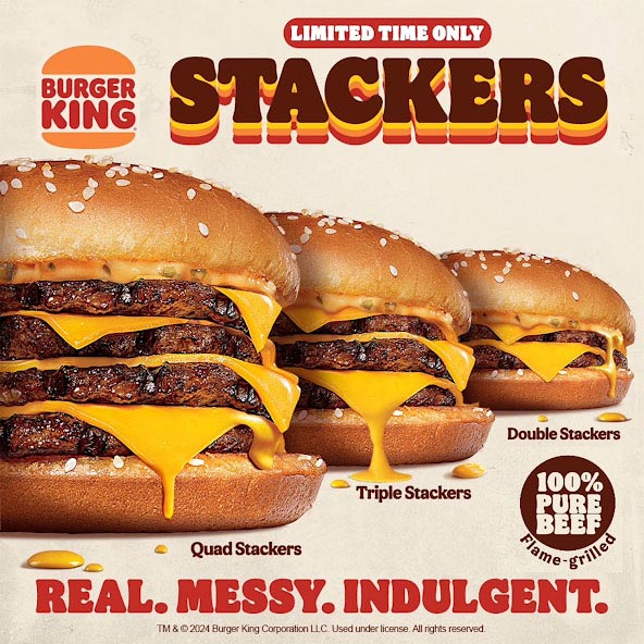 Featuring 100% beef flame-grilled patties, a generous layer of oozing melted American cheese, a special tangy sauce, and a whole lot of flavor, BK Stackers lets you enjoy the burger experience by going loud, and messy.