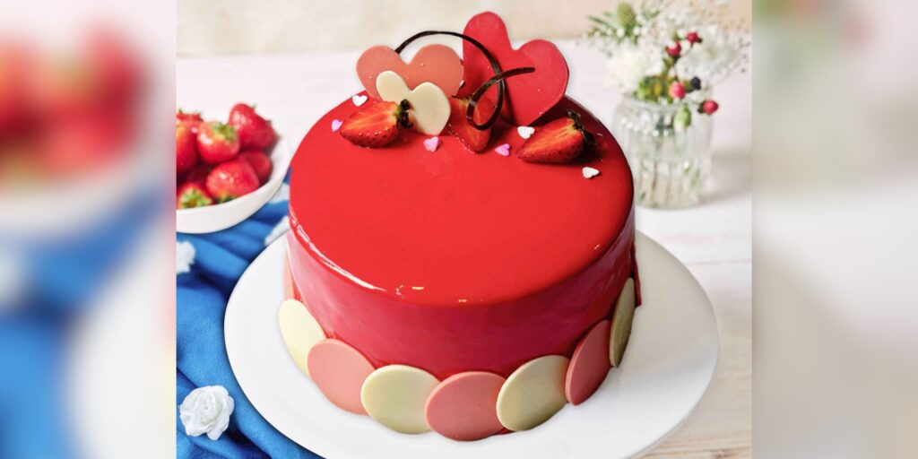 An elegant symphony of flavors and textures, the Strawberry Le Baiser Cake is a refined indulgence. It is a delicate fusion of soft vanilla sponge, velvety white chocolate mousse, and vibrant strawberry chunk compote. Enrobed in a glossy white couverture chocolate glaze with a bold red hue, this elegant creation is a true celebration of flavor and sophistication.