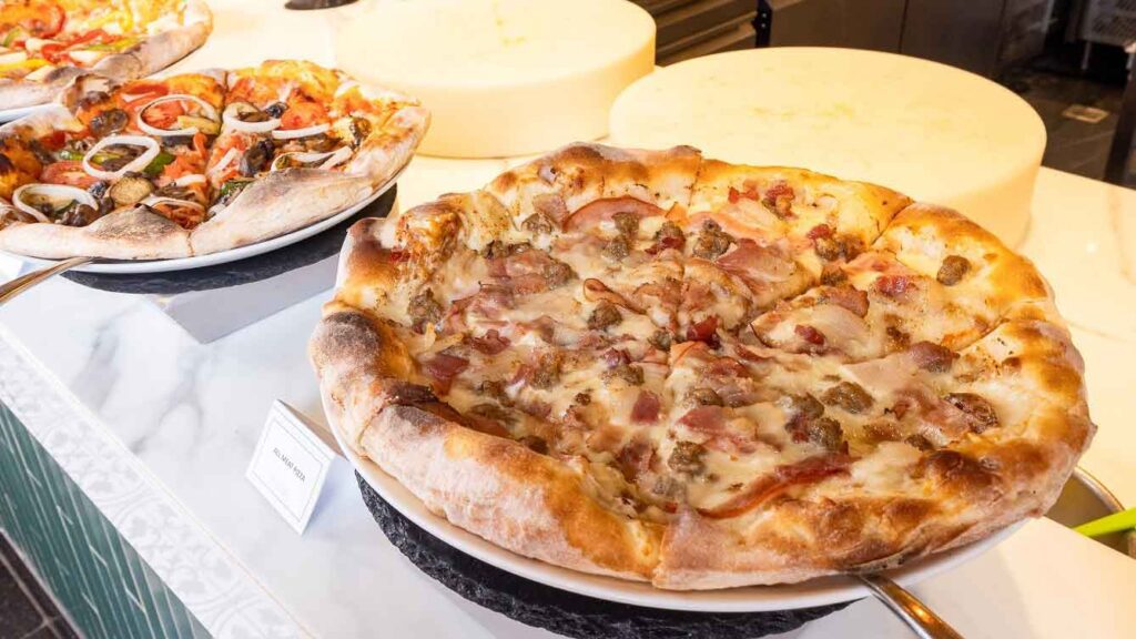 City of Dreams Manila’s pizzeria, known for its Roman-style pizzas, offers a Sunday Brunch experience. The pasta station highlights chicken fettucine alfredo and penne arrabbiata with shrimp prepared à la minute, while the pizza station features bacon and onion, all-meat and vegetable pizza.