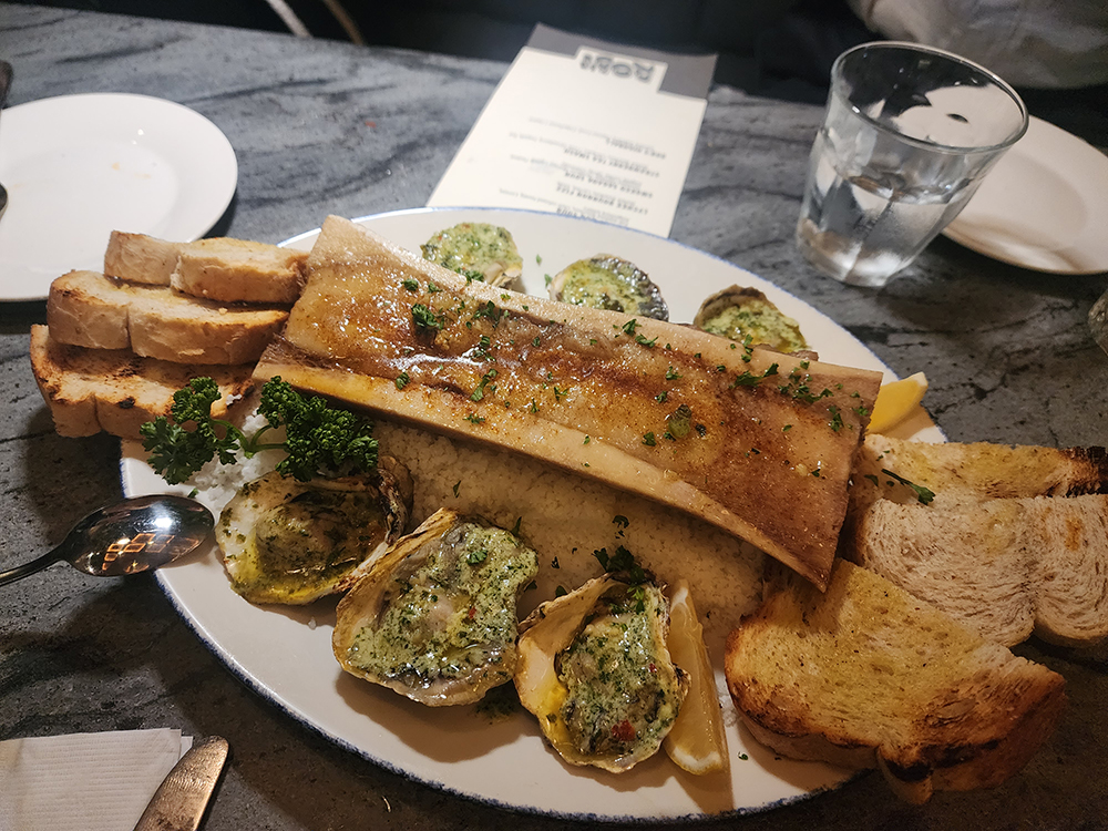 For those who want their oysters cooked, Rob’s also offers grilled and broiled options, from the fiery Diablo and the smokey Chipotle Bourbon, to the classic herbed garlic butter and Oysters Rockefeller. But for those who want to take it up a notch, the Awww Shucks delivers with aplomb. Here, 6 pieces of Garlic Herb Buttered oysters flank a sizable hunk of roasted bone marrow and served with sourdough on the side.