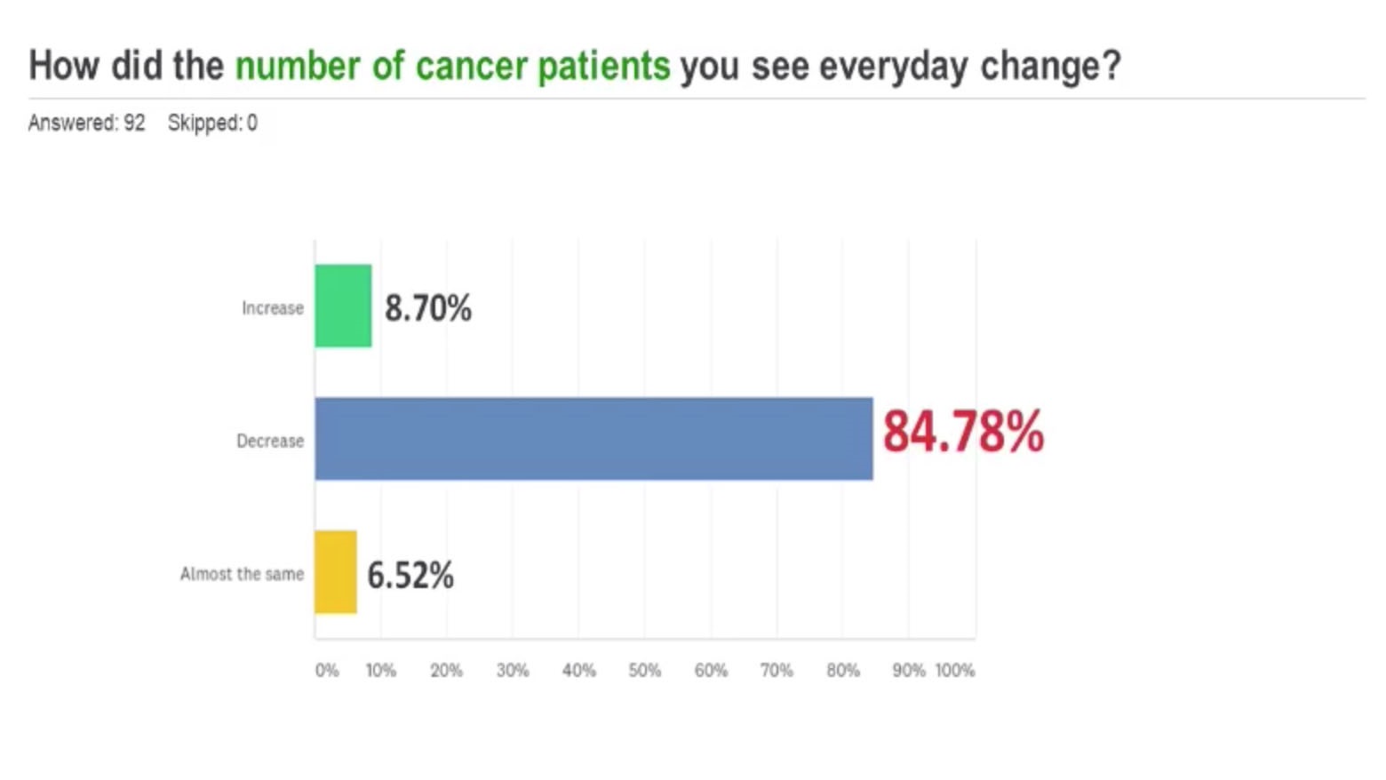 Dela Cruz and Espiritu are outliers. Based on a survey of 92 cancer specialists from the Philippine Society of Medical Oncology (PSMO), a group of board-certified cancer doctors in the country, nearly 85 percent said they observed a decrease in the number of patients they saw everyday.