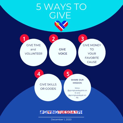 GivingTuesday Philippines hopes to encourage more people to share their expressions of generosity and kindness, and join this movement online by using the hashtag #GivingTuesdayPH starting December 1, 2020. The public is encouraged to share any way they express their generosity and kindness. It does not have to be limited to giving monetary or in-kind assistance. One can share stories online to inspire others, share calls for donations online, advocate for a cause, collaborate with various organizations, among others.