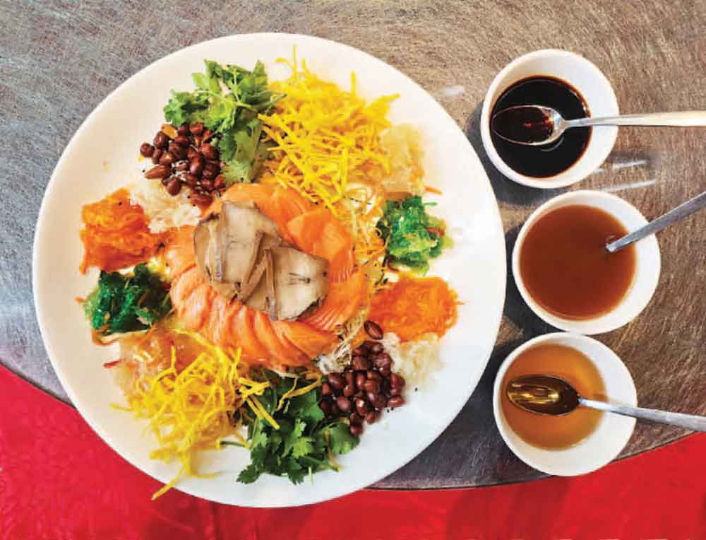 The star of the special Chinese New Year menu is the Yusheng or Prosperity Toss. Here, slivers of buttery abalone, fresh salmon jellyfish, and an assortment of vegetables, both raw and pickled, are seasoned with a rich plum sauce combined with soy sauce and sesame oil. All the ingredients are then tossed high in the air by diners as they shout out their wishes, with the belief that a higher toss will attract more luck for the year.