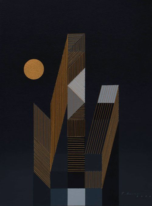 Adaptation, change, transformation and mutability are the primary themes that characterize Patrick Esmao’s works for “Concrete Transcendence”. These issues manifest themselves in different ways — sometimes it is through the combination of disparate elements — a flower, bird, or landscape merging with mechanical or technical structures — other times, it is through geometric forms. Whether the forms are abstract or representational, there is always a sense of alteration or development into something new.