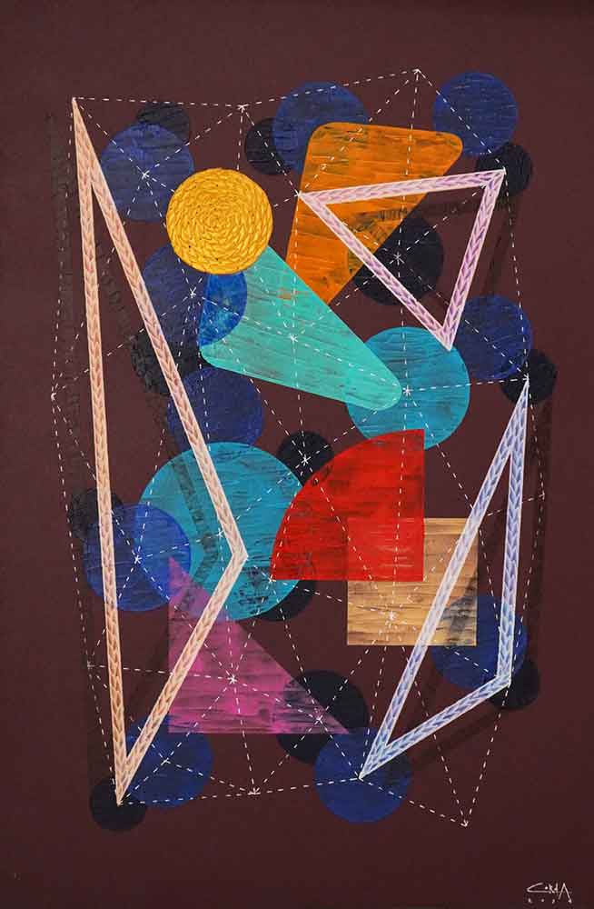 As a professional architect turned artist, Seth Corda’s creations reflect his architectural roots while offering a contemporary artistic perspective. His meticulous attention to structure, nature, and order shines through in his compositions, where figurative and architectural elements converge into abstract shapes filled with intricate patterns and sharp palette knife strokes. His architectural background drives his curiosity about “Geometry in Motion”, evident in his use of lines and shapes in this series and his works in general.