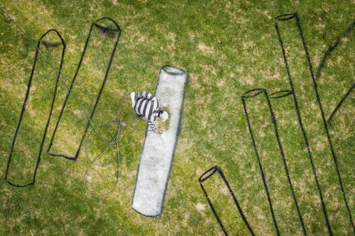 The artist Saype, whose real name is Guillaume Legros, has painted his temporary, biodegradable images on lawns en.saype-artiste.com/lumiere from Yamoussoukro in Ivory Coast to the Champ de Mars next to the Eiffel Tower in Paris, often depicting children or a close-up of two people’s hands gripping each other’s forearms.
