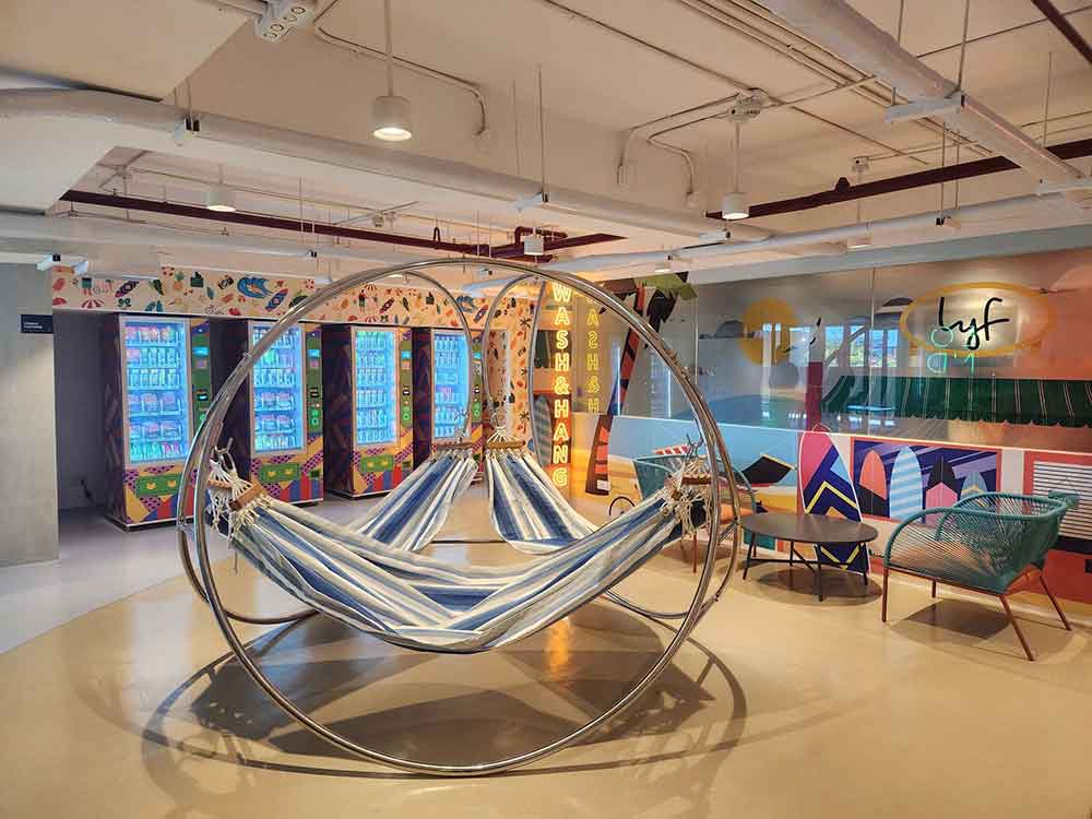 The Wash and Hang is the Social Launderette. Guests can laze about in the hammocks or enjoy a drink from the vending machines as they wait for the self-serve laundry machines to finish their wash and dry cycles. Meanwhile, Bond is the shared kitchen which is stocked with all the essential kitchen equipment needed to whip up a complete meal. After taking a bite, guests can then go to the Burn Gym to get their fitness fix.