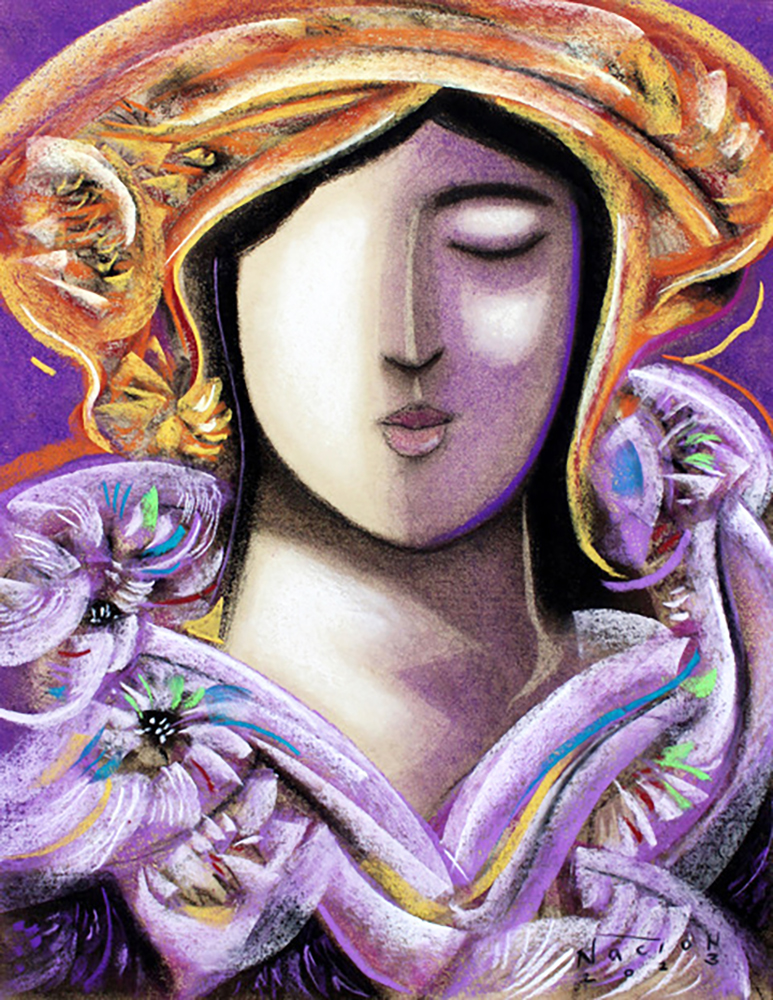 Francis Nacion has been exhibiting for more than a decade. His works are recognizable for the brightly colored half-faced characters often portrayed in genres of happy and contented people harvesting bountiful harvests, families spending time together at home, romantic serenades, and friends having fun; bringing the subjects of Amorsolo and his ilk to the contemporary. His works are meticulously worked with sgraffito (etched or scratched on the wet oil paint) to create fantastic patterns on clothes and similar open surfaces imitating beautiful embroidery or textile patterns.