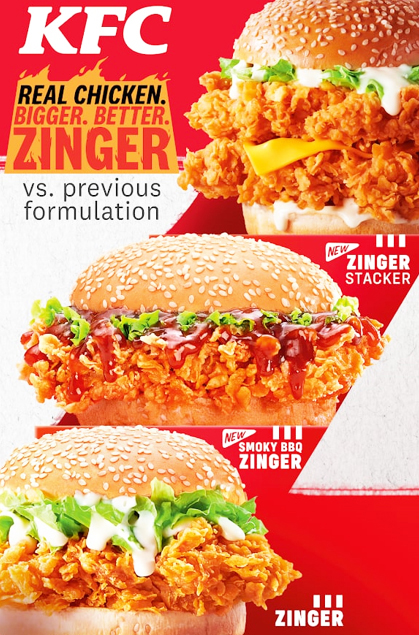 You can always go back to your all-time favorite KFC Zinger, the signature chicken sandwich made of real chicken, now bigger and better compared to its previous formulation.