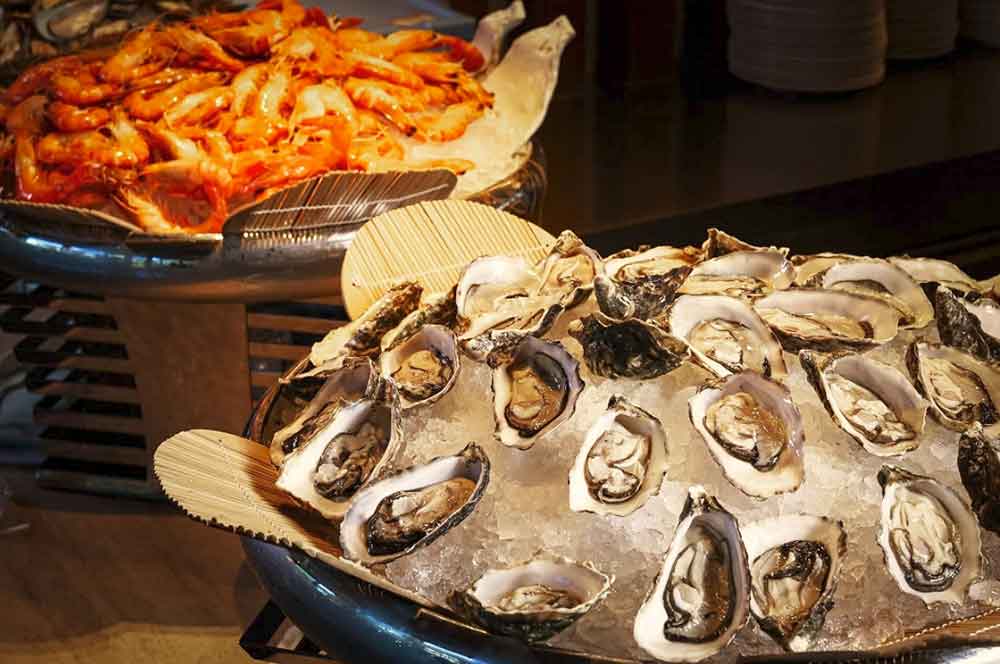 Appetizers and salads, newly baked bread and delicious charcuterie, fresh seafood on ice, Japanese sushi and sashimi station, noodles station, premium meat carvings, and extensive dessert spread complete the exceptional culinary experience.