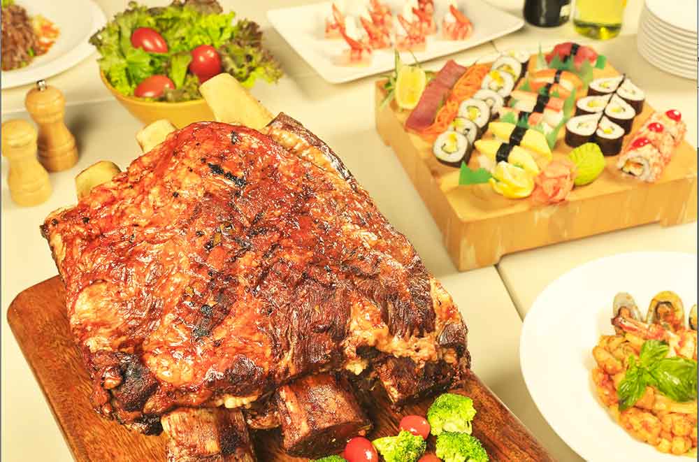 Not to be missed on the hybrid buffet which also includes an all-you-can-eat a la carte dishes. On Sunday, the lavish spread includes a carving station consisting of roasted whole U.S. Prime Ribeye, Smoked Beef Brisket, and Grilled Tuna Collar; and at the sushi station, fresh slices from a whole salmon.