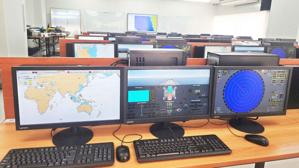 A smaller bridge simulator is also available to allow more cadets to get hands-on experience. These simulators can recreate various scenarios, including different weather conditions, maritime traffic, wave patterns, and even actual port locations. A separate monitoring room allows instructors to modify the parameters and oversee each simulated exercise.