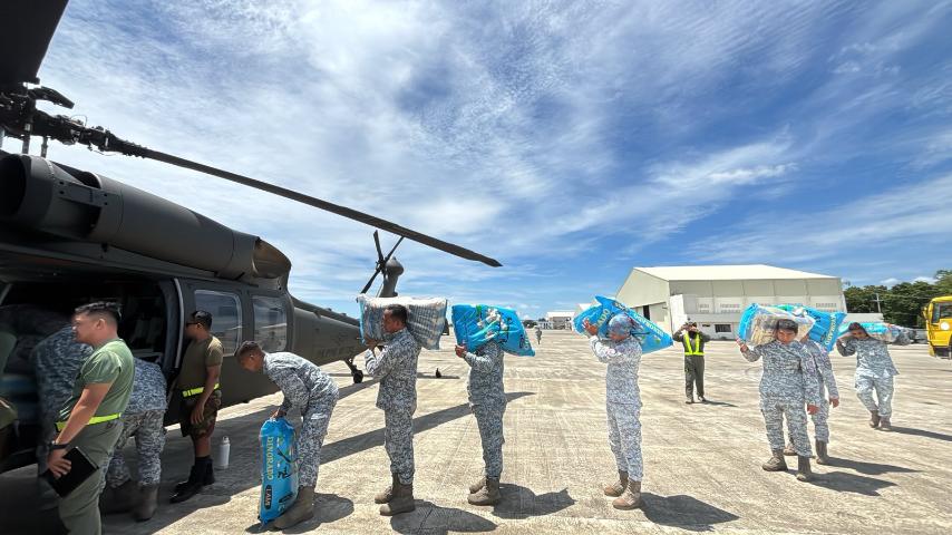 The Philippine Air Force airlifted essential supplies, including sacks of rice and family food packs, using Black Hawk helicopters to reach affected communities.