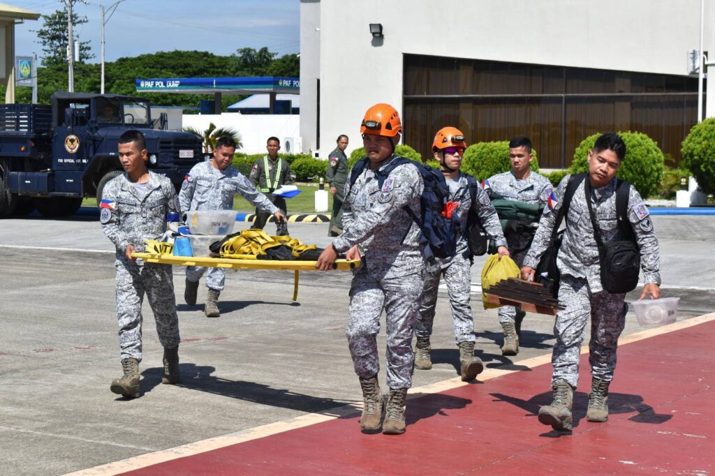 PAF responders carry rescue equipment to assist earthquake victims in Bogo City, Cebu, on October 1, 2025. (Photo courtesy of PAF)