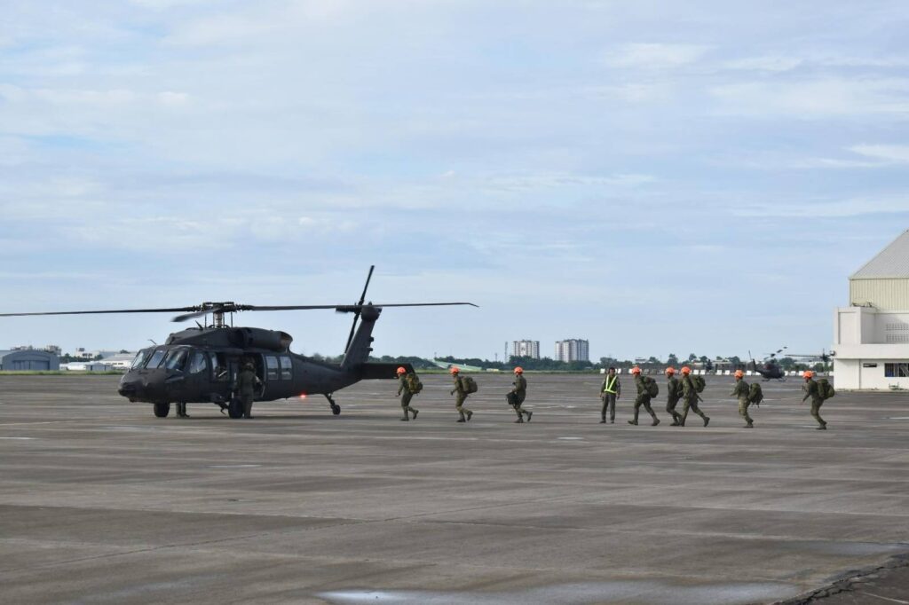 PA HADR team board onto a Black Hawk helicopter at BGBNEAB in support of SAR operations in Bogo City, Cebu on October 1, 2025. (Photo courtesy of PAF)