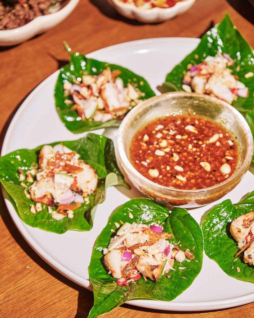 Complementing the exceptional food is an environment designed by Hong Kong-based LC Studio. The 124-seat restaurant features two main dining areas and three private dining rooms (ranging from 6 to 20 guests). The design incorporates traditional Thai elements like woven details and radial patterns, reinterpreted with modern elements. Adding an entertainment dimension, the two larger private rooms feature karaoke, celebrating a beloved pastime among Thais and Filipinos. A thoughtfully curated drinks list features cocktails and beers designed to enhance the cuisine.