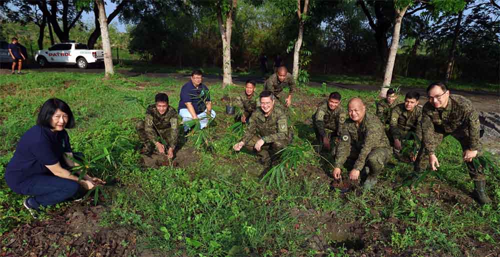 Pilot project. Pushing for climate change consciousness is a priority for the Philippine Army and this explains why giant bamboos will soon rise at an eight-hectare pilot project by the Armor (Pambato) Division at Camp O’Donnel in Tarlac. Photo shows Army officials, led by Maj. Gen. Facundo O. Palafox IV, Colonels. Charlemagne Batayola and Victor Llapitan, Lt. Colonels Reynaldo Mina, Ferdinand de la Cruz, Romeo Gabor and Albert Beran, Maj. Nilbert Dagpin, planting giant bamboo seedlings in the company of Tarlac Heritage Foundation co-founders Isabel Cojuangco Suntay and her daughter Isa.