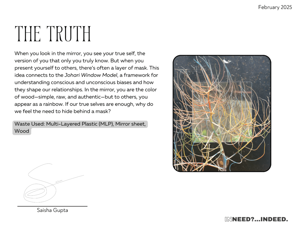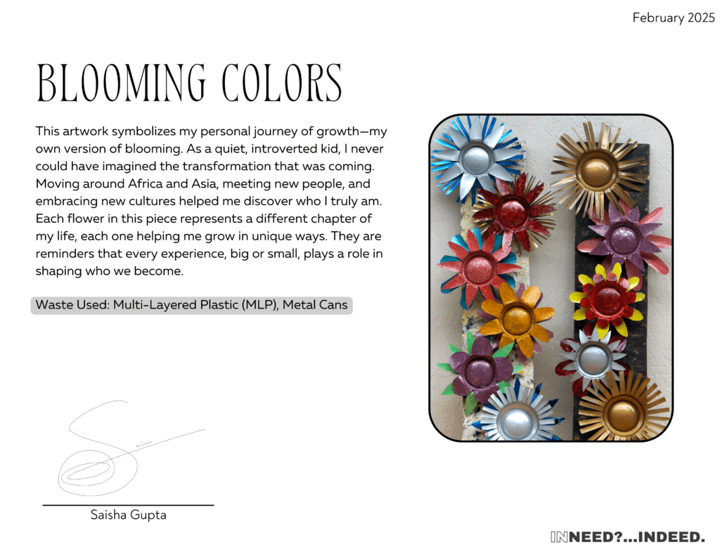 Gupta emphasizes the importance of sustainability, stating, “As the world is evolving, our generation is responsible for the planet that we call home…Awareness is key, but action is what defines changes.” Her work aims to demonstrate the coexistence of sustainability and art, using artistic expression to upvalue waste and connect with others through shared experiences.