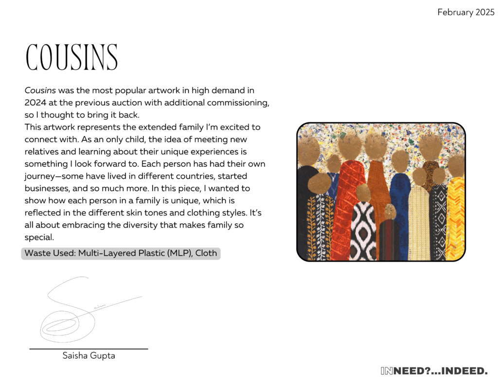 Gupta established “In Need?…Indeed.” one and a half years ago as a platform to merge her artistic talents with community service. Following a successful first auction in January 2024, which raised PHP 110,000 for Chosen Children Village through the sale of 14 artworks, Gupta organized a second auction in February 2025. This year, she auctioned 19 of her artworks, directing the proceeds to RSCC.