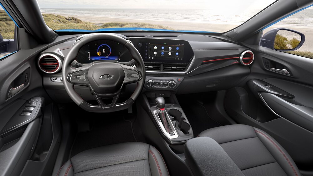 • The Redline showcases a more gritty look stimulated by striking red accents on the gloss black grille, gloss black bumper chin and rear bumper garnish, gloss black side mirrors, black 18” alloy wheels, black roof rail, black Trax badge and a black Chevy bowtie furnishing