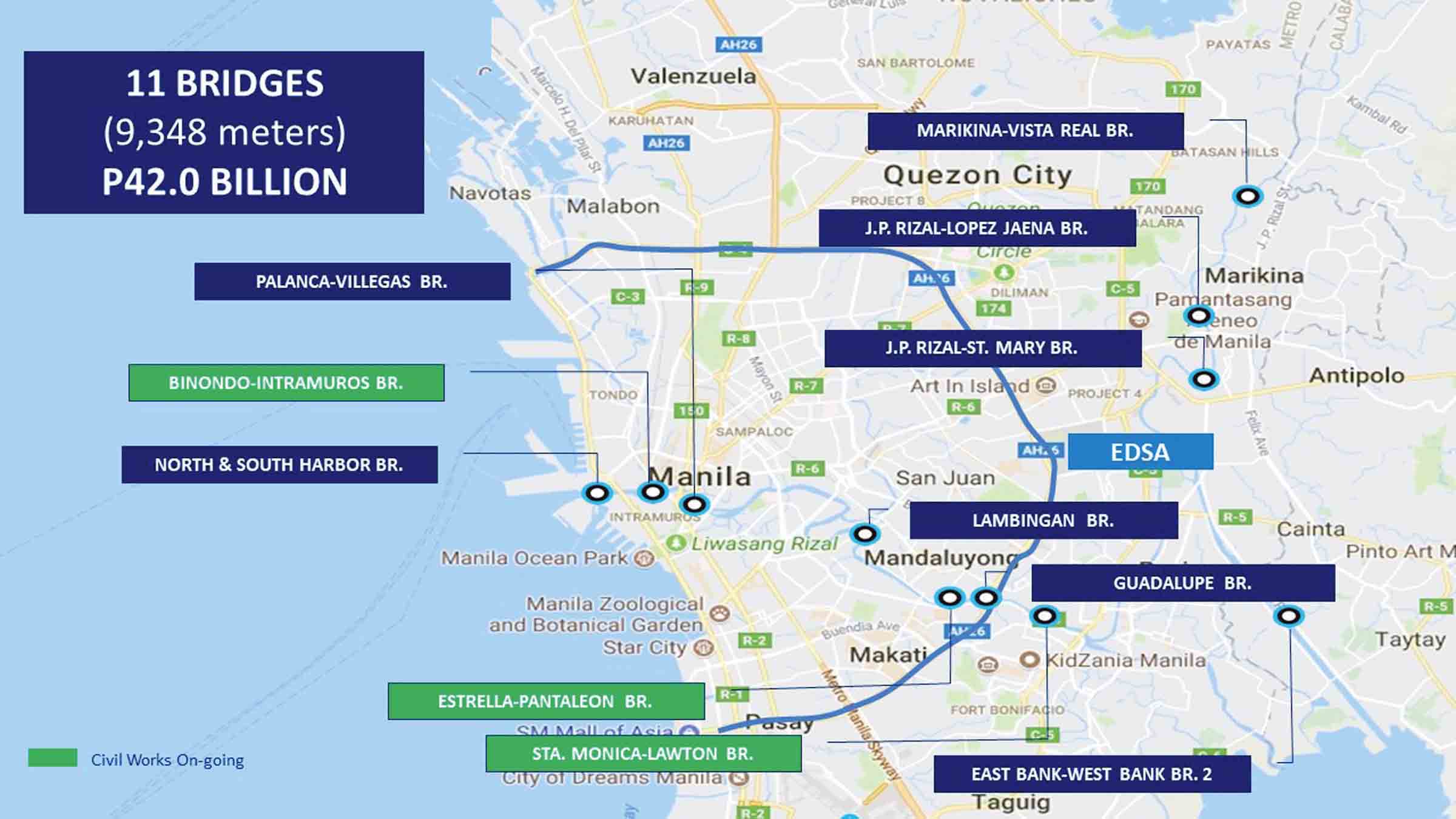 - Not directly related to decongestion but will bring in a greater sense of safety and security is P7.93 billion Metro Manila Priority Bridges Seismic Improvement Project. Set for replacement of outer bridges and substructures, as well as rehabilitation and re-engineer are the Guadalupe bridge and the vertical geometry improvement of the Lambingan bridge.