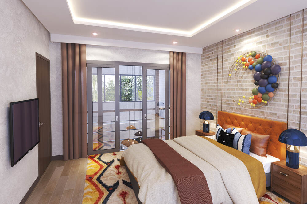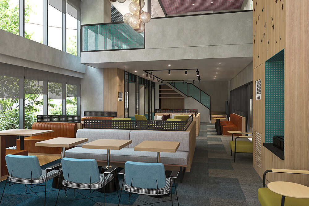 Inside, residents will be welcomed to a high-ceiling lobby characterized by modern and industrial contemporary design. Earth tones are highlighted throughout the space through the use of natural stones and porcelain tiles, complemented by a pop of colors from upbeat art pieces and a mixture of vibrant and refined furniture.